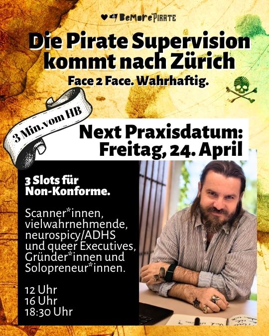 Diese Anteile haben hier Platz. Weil ich sie selbst in mir trage und du den Preis des Andersseins im Business kennst. Das ist kein Zustand, das ist ein dauerhaftes Spannungsfeld. Die Pirate Supervision ist der Raum, in dem damit gearbeitet werden kann.